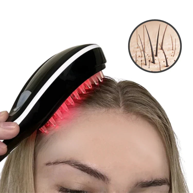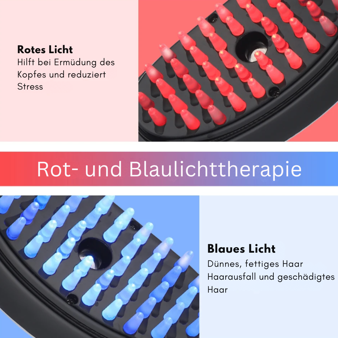 Die HaarGlanz-Bürste ist ein multifunktionales Haarpflegegerät, das Rot- und Blaulichttherapie, eine vibrierende Kopfhautmassage und einen ätherischen Öldiffusor kombiniert. Das rote Licht stimuliert die Haarfollikel und fördert das Haarwachstum, während das blaue Licht hilft, Bakterien zu reduzieren und die Ölproduktion auf der Kopfhaut zu regulieren. Die vibrierende Massage erhöht die Blutzirkulation in der Kopfhaut, und der Diffusor verteilt ätherische Öle, um das Haar zu hydratisieren und zu nähren.