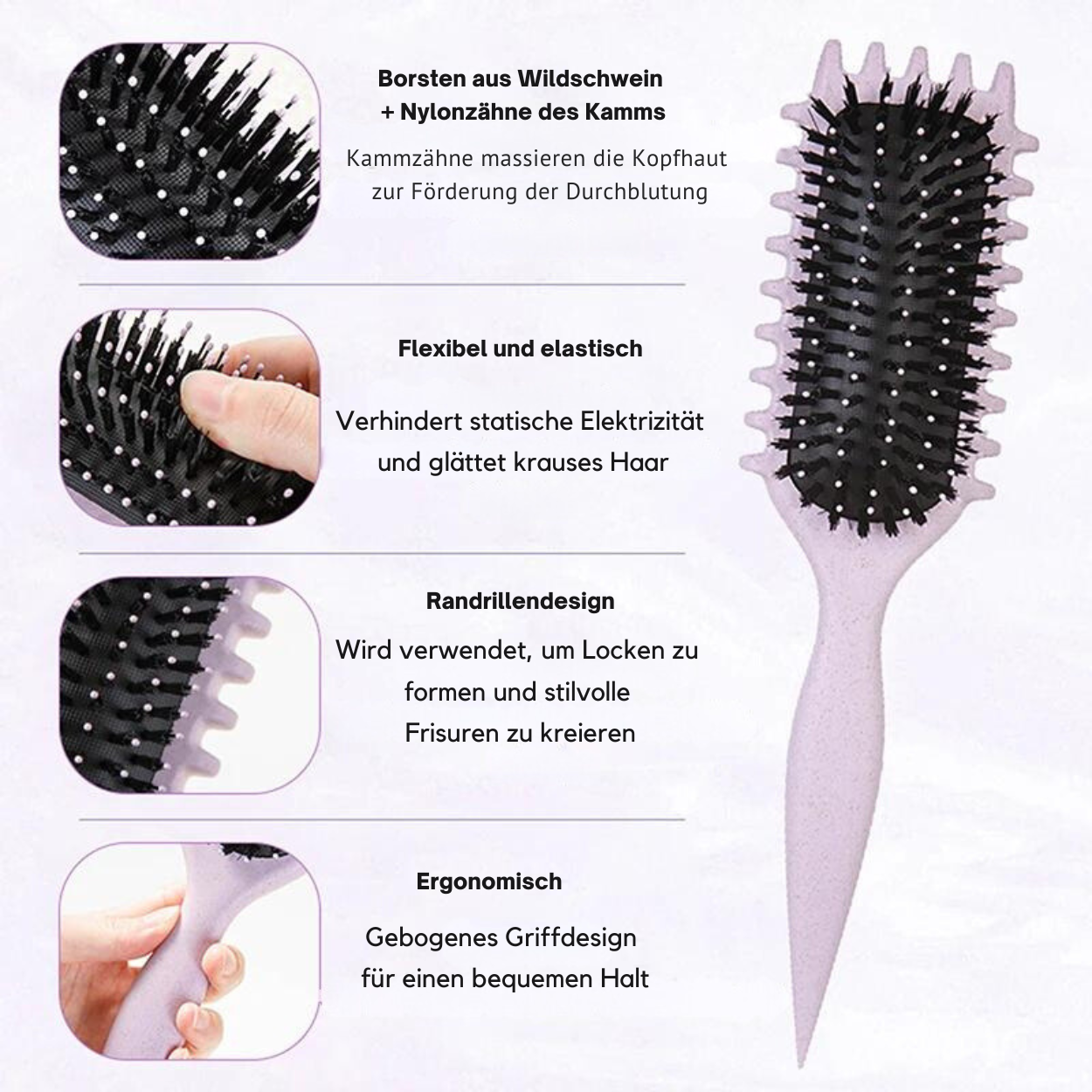 Die Kombination aus flexiblen Nylon- und Wildschweinborsten entwirrt Ihr Haar sanft und verteilt natürliche Öle, um Frizz zu reduzieren und Glanz zu fördern. Die einzigartige Borstenmischung sorgt dafür, dass die Bürste reibungslos durch das Haar gleitet, wodurch Haarbruch reduziert und Ihre Locken vor Schäden geschützt werden.