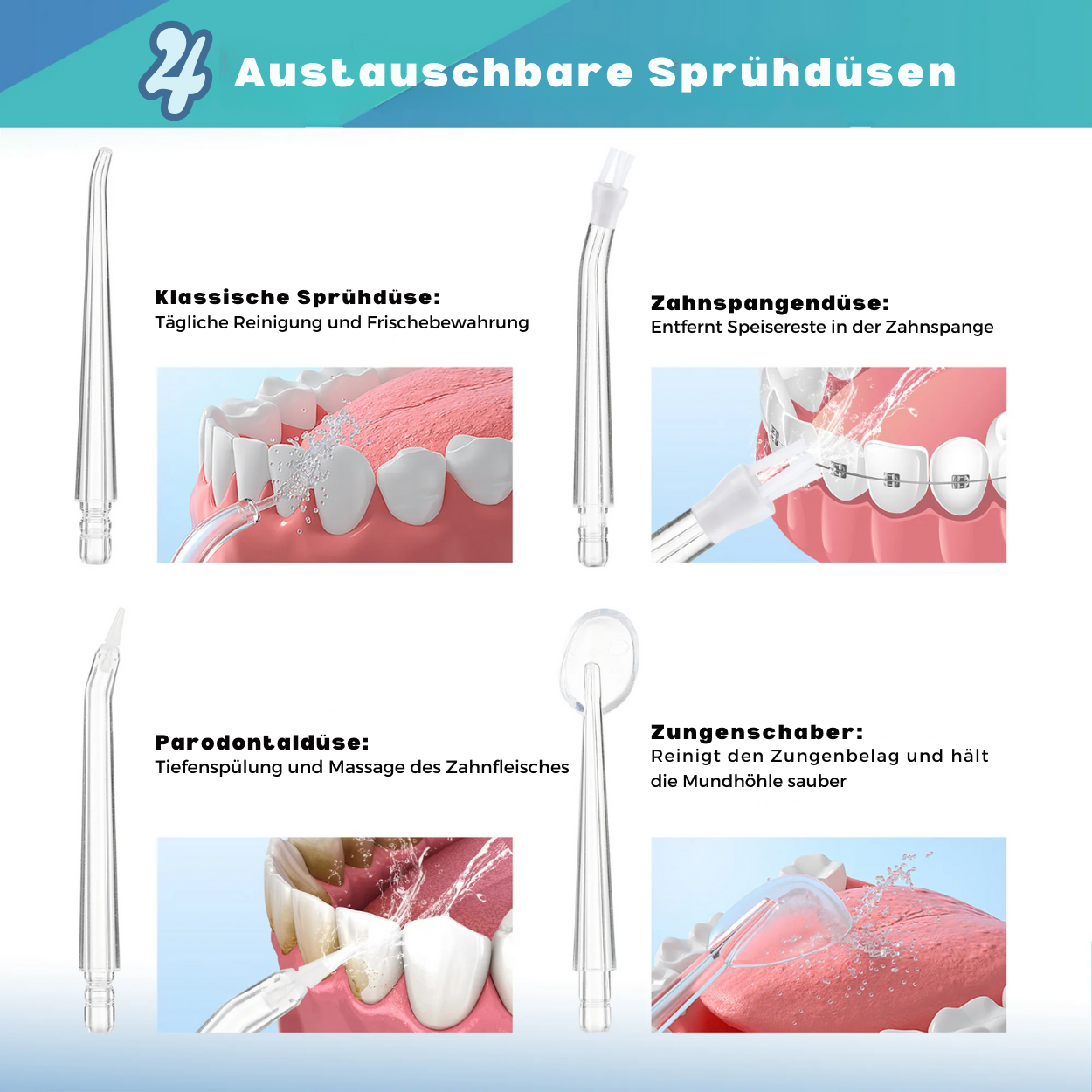 Der PowerFloss™ Wasserflosser bietet eine gründliche Reinigung, die dein Selbstbewusstsein stärkt. Nach der Anwendung fühlst du dich frisch, sauber und bereit, der Welt mit einem Lächeln zu begegnen, das einfach nicht zu übersehen ist.