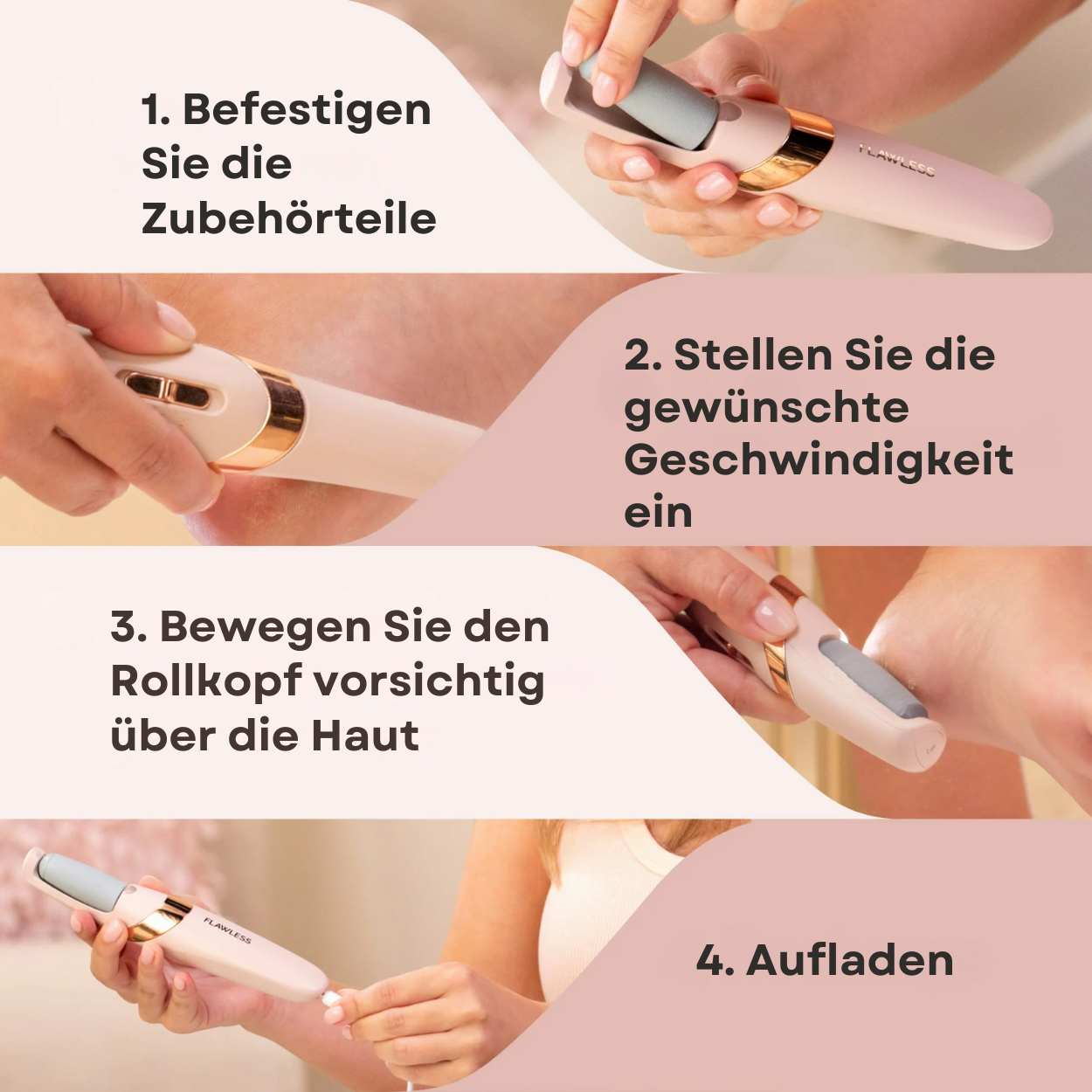 Das Elektrische Pediküre-Werkzeug™ ist für sowohl Hände als auch Füße geeignet. Es wird mit verschiedenen Aufsätzen geliefert, die sich leicht austauschen lassen, um unterschiedliche Hautbereiche und Bedürfnisse zu erfüllen.