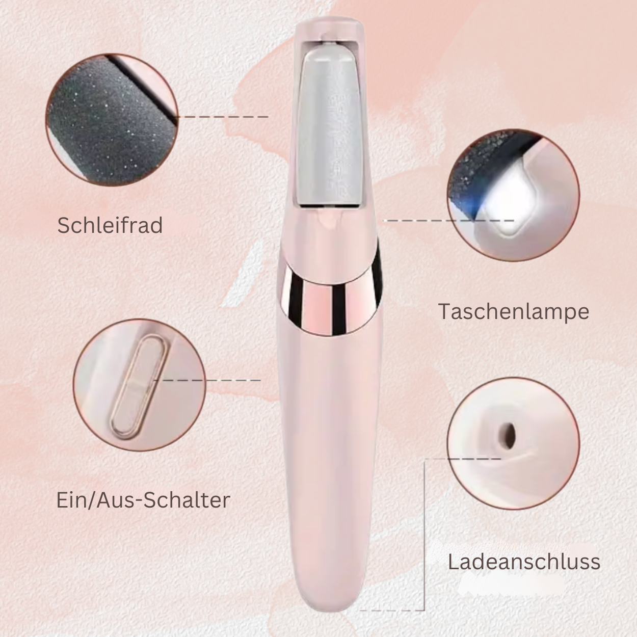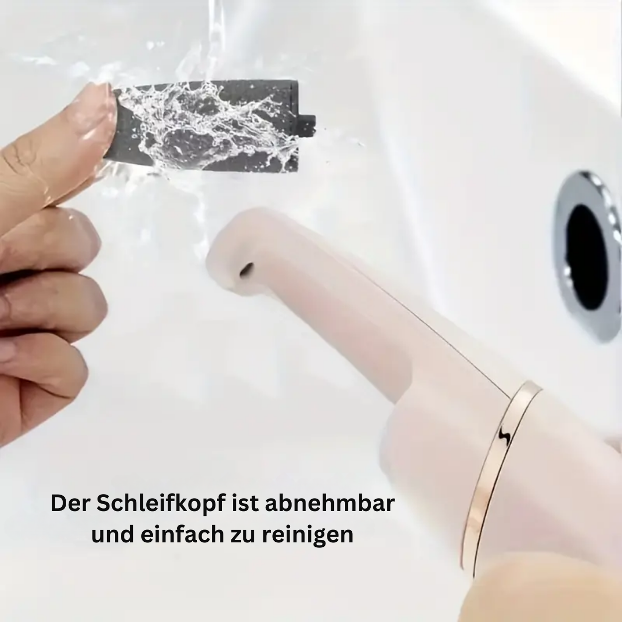 Der abnehmbare Schleifkopf kann einfach unter Wasser abgespült werden, um eine hygienische Anwendung zu gewährleisten. Das Gerät selbst ist ebenfalls leicht zu reinigen, sodass Sie stets eine saubere und frische Anwendung genießen können.