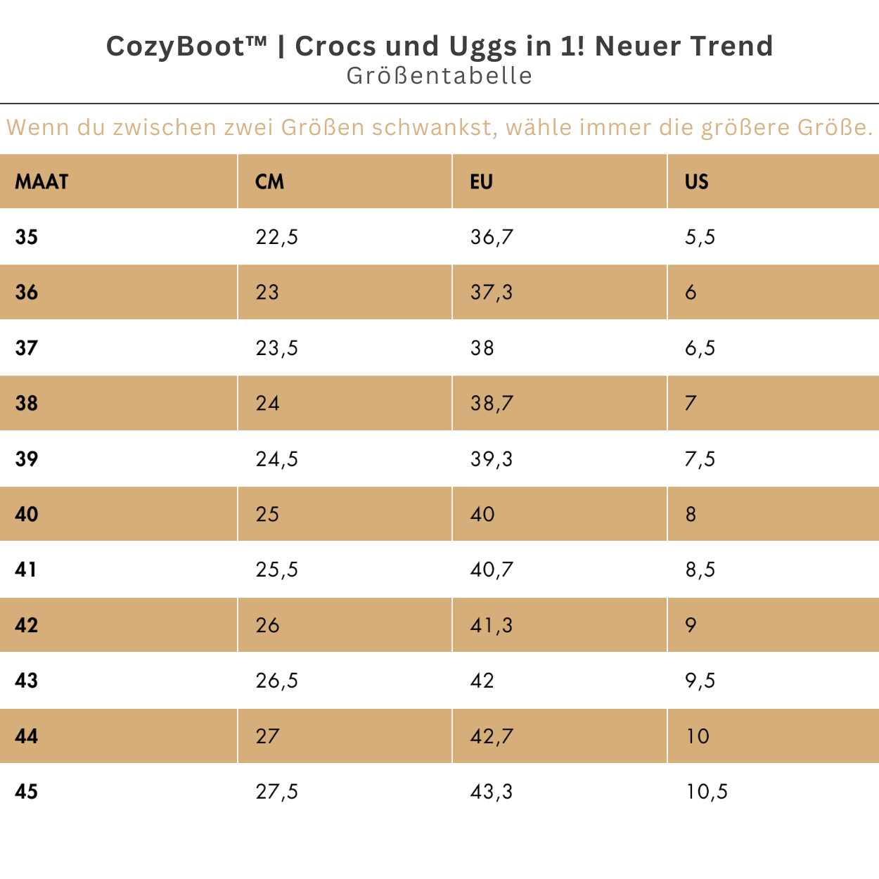 Einzigartige Kombination: Der CozyBoot™ vereint das Beste aus beiden Welten. Er hat die Leichtigkeit und Einfachheit von Crocs, kombiniert mit dem Luxus und der Wärme von Uggs. Das Ergebnis? Ein ebenso bequemer wie modischer Schuh, perfekt für jede Gelegenheit.