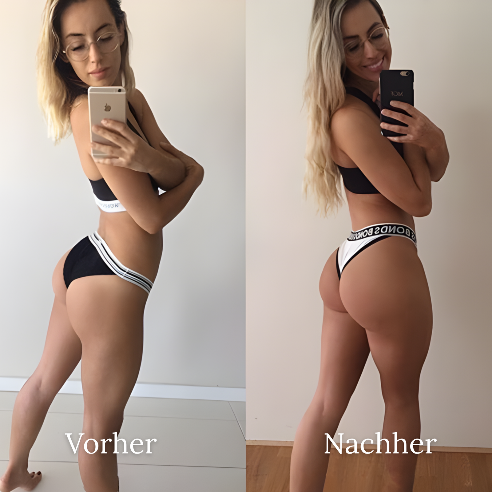 Viele Frauen bemerken bereits nach 2 bis 3 Wochen regelmäßiger Anwendung sichtbare Veränderungen. Der Po fühlt sich fester an, und die Form wirkt runder und definierter.