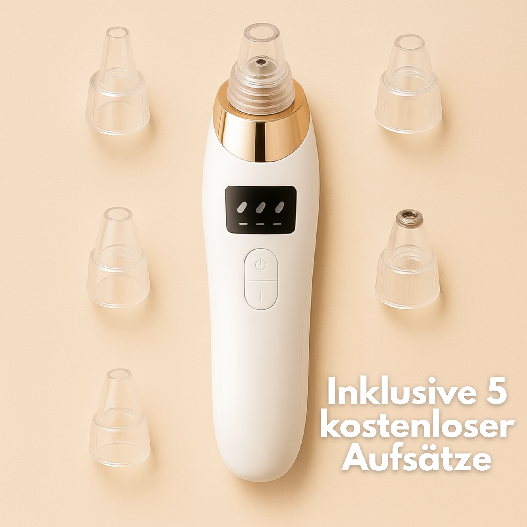 Jeder der 5 Aufsätze ist für eine bestimmte Zone und Anwendung entwickelt, zum Beispiel zum Entfernen von Mitessern, zum sanften Peelen oder zum Straffen und Revitalisieren der Haut. Lesen Sie die Anleitung für eine detaillierte Beschreibung der einzelnen Aufsätze.
